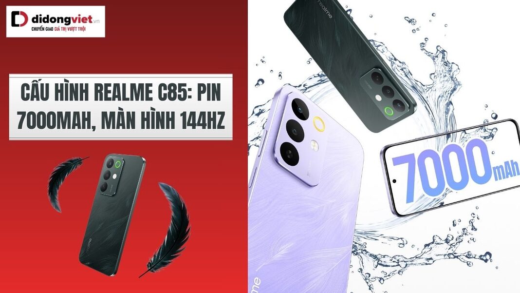 Cấu hình realme C85 nổi bật với viên pin 7000mAh lớn nhất lịch sử dòng C kết hợp màn hình 144Hz siêu mượt. Đây là mẫu smartphone tầm trung sở hữu nhiều điểm nhấn công nghệ đáng chú ý từ nhà realme.