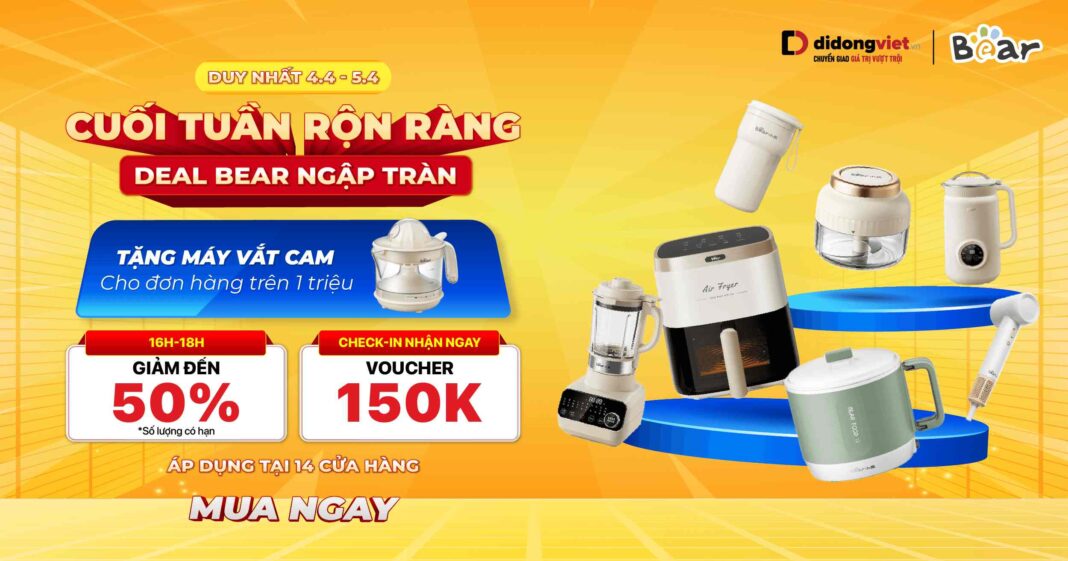 Bạn đang muốn “F5” căn bếp của mình với những thiết bị vừa xinh xắn, vừa đa năng? Hay đơn giản là tìm kiếm một món quà ý nghĩa cho người thân? Đừng bỏ lỡ ngày hội mua sắm “Cuối tuần rộn ràng – Deal Bear ngập tràn” duy nhất từ ngày 04.04 đến 05.04 tại hệ thống Di Động Việt.