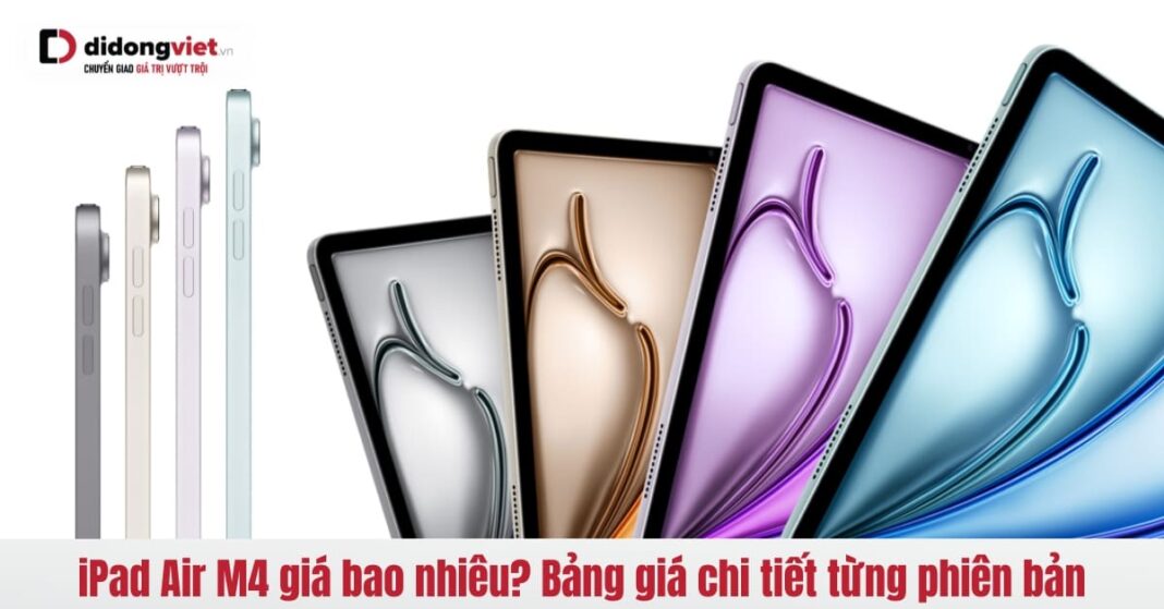 iPad Air M4 có hai kích thước 11 inch và 13 inch, bốn màu Xám Không Gian, Xanh Dương, Tím và Ánh Sao, dung lượng từ 128GB đến 1TB. Cả hai kích thước đều có phiên bản Wi-Fi và Wi-Fi + Cellular với modem Apple C1X hỗ trợ 5G. Giá iPad Air M4 thay đổi tùy theo kích thước, dung lượng và loại kết nối. Bài viết sau, Dchannel sẽ tổng hợp bảng giá đầy đủ tại Di Động Việt và phân tích chi tiết để giúp bạn chọn đúng cấu hình phù hợp.
