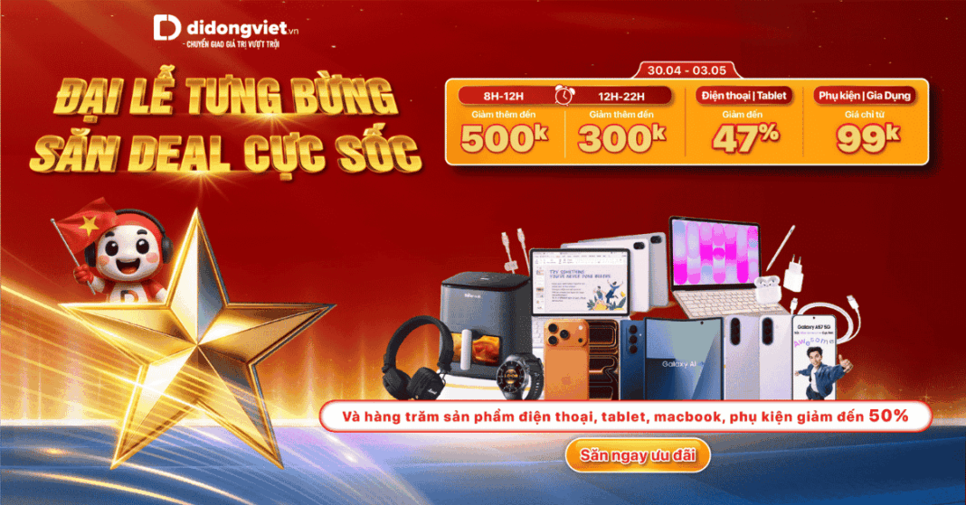 Chương trình “ĐẠI LỄ TƯNG BỪNG – SĂN DEAL CỰC SỐC” tại Di Động Việt thực sự là một ngày hội công nghệ lớn nhất năm. Với mức giảm giá lên đến 47% cho điện thoại, phụ kiện chỉ từ 99k và MacBook, iPhone, Đồng hồ, Âm thanh giảm đến 50%, đây là cơ hội có một không hai để bạn nâng cấp thiết bị của mình. Hãy nhanh chân đến cửa hàng Di Động Việt gần nhất từ ngày 30.4 để trở thành những người đầu tiên sở hữu những siêu phẩm giá sốc này!