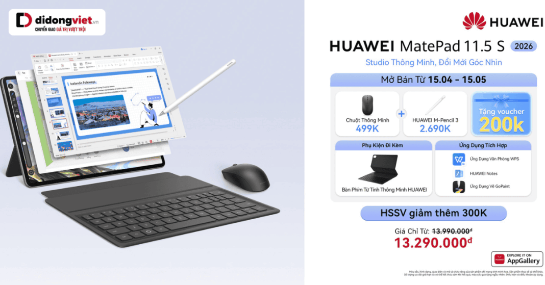 Huawei MatePad 11.5 S 2026 đã chính thức cập bến Di Động Việt! Với màn hình PaperMatte độc quyền đem lại cảm giác như giấy viết cùng hiệu năng mạnh mẽ, đây là mẫu máy tính bảng hứa hẹn sẽ “làm mưa làm gió” trong phân khúc 13 triệu đồng. Đặc biệt, khi sở hữu máy trong giai đoạn mở bán từ 15/04 đến 15/05, bạn sẽ nhận được bộ quà tặng trị giá hàng triệu đồng cùng những đặc quyền chỉ có tại Di Động Việt.