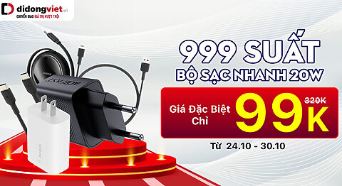 Từ 24.10 - 06.11, duy nhất tại Di Động Việt, khách hàng có cơ hội mua combo Củ sạc + Cáp sạc nhanh 20W...
