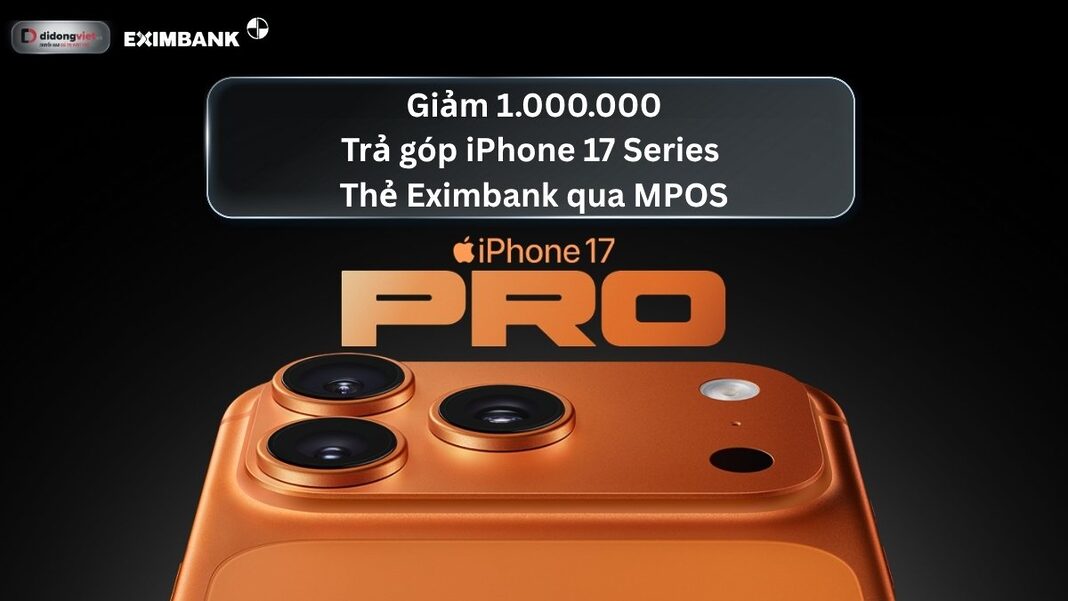 Di Động Việt xin trân trọng thông báo: Từ ngày 06/10/2025 đến 31/12/2025, khách hàng mua iPhone 17 Series tại Di Động Việt sẽ được giảm ngay 1.000.000đ khi chọn hình thức trả góp qua thẻ tín dụng Eximbank qua MPOS. Đây là cơ hội vàng để những ai yêu thích công nghệ cao cấp được chạm tay vào siêu phẩm mới nhất từ Apple với mức chi phí nhẹ nhàng hơn.