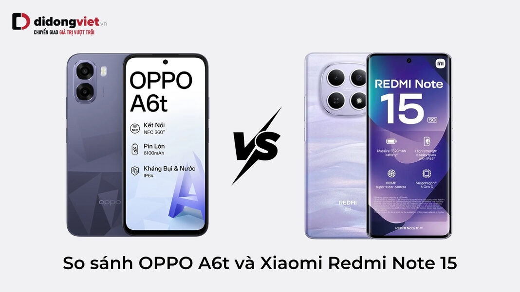 Hãy cùng didongviet.vn so sánh OPPO A6t và Xiaomi Redmi Note 15 chi tiết để tìm ra lựa chọn tối ưu nhất. Từ hiệu năng, camera, pin đến thiết kế, mình sẽ phân tích toàn diện để bạn đưa ra quyết định mua sắm thông minh nhất.