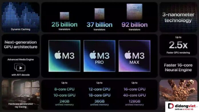 Cùng Di Động Việt tìm hiểu chip Apple M3, M3 Pro, M3 Max – Tiến trình 3nm, GPU nhanh hơn, mạnh hơn