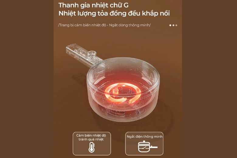 Nồi lẩu điện mini 1.6L đa năng Bear DRG-P16M2 sở hữu một trong những điểm tinh tế và đáng giá nhất của sản phẩm chính là cơ chế làm nóng bằng thanh gia nhiệt hình chữ G độc đáo, một cải tiến kỹ thuật không thể bỏ qua đối với những ai quan tâm đến hiệu suất nấu nướng và chất lượng món ăn.