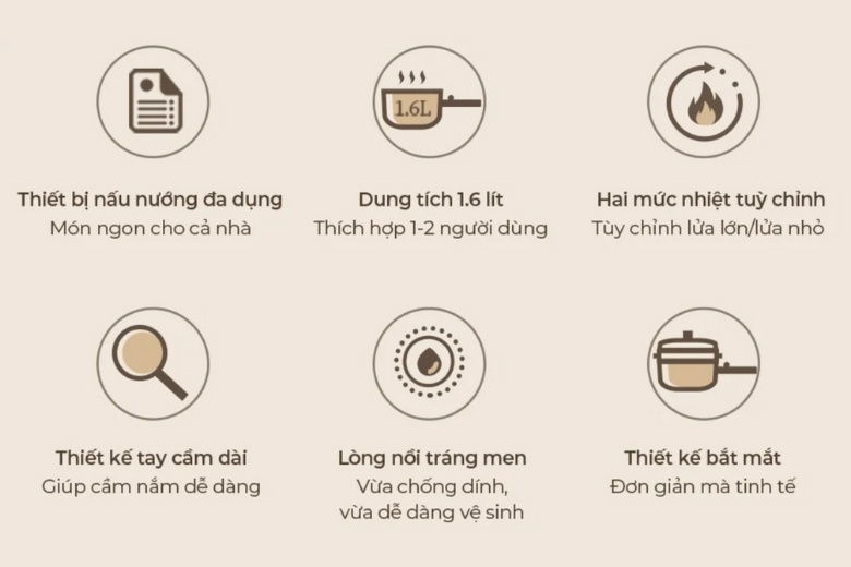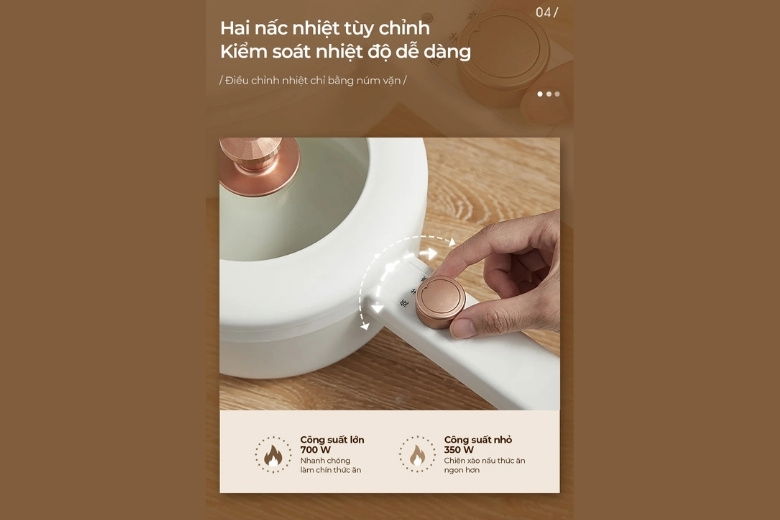 Ở chế độ nhiệt thấp, nước sôi nhẹ nhàng, lý tưởng để ninh, hầm hoặc giữ ấm thực phẩm. Trong khi đó, chế độ nhiệt cao lại đủ sức mạnh để chiên, xào nhanh, giúp món ăn giữ được độ giòn hấp dẫn mà không bị ngấm dầu. Việc thay đổi nhiệt độ chỉ cần thao tác xoay núm đơn giản, không cầu kỳ nhưng cực kỳ hiệu quả.
